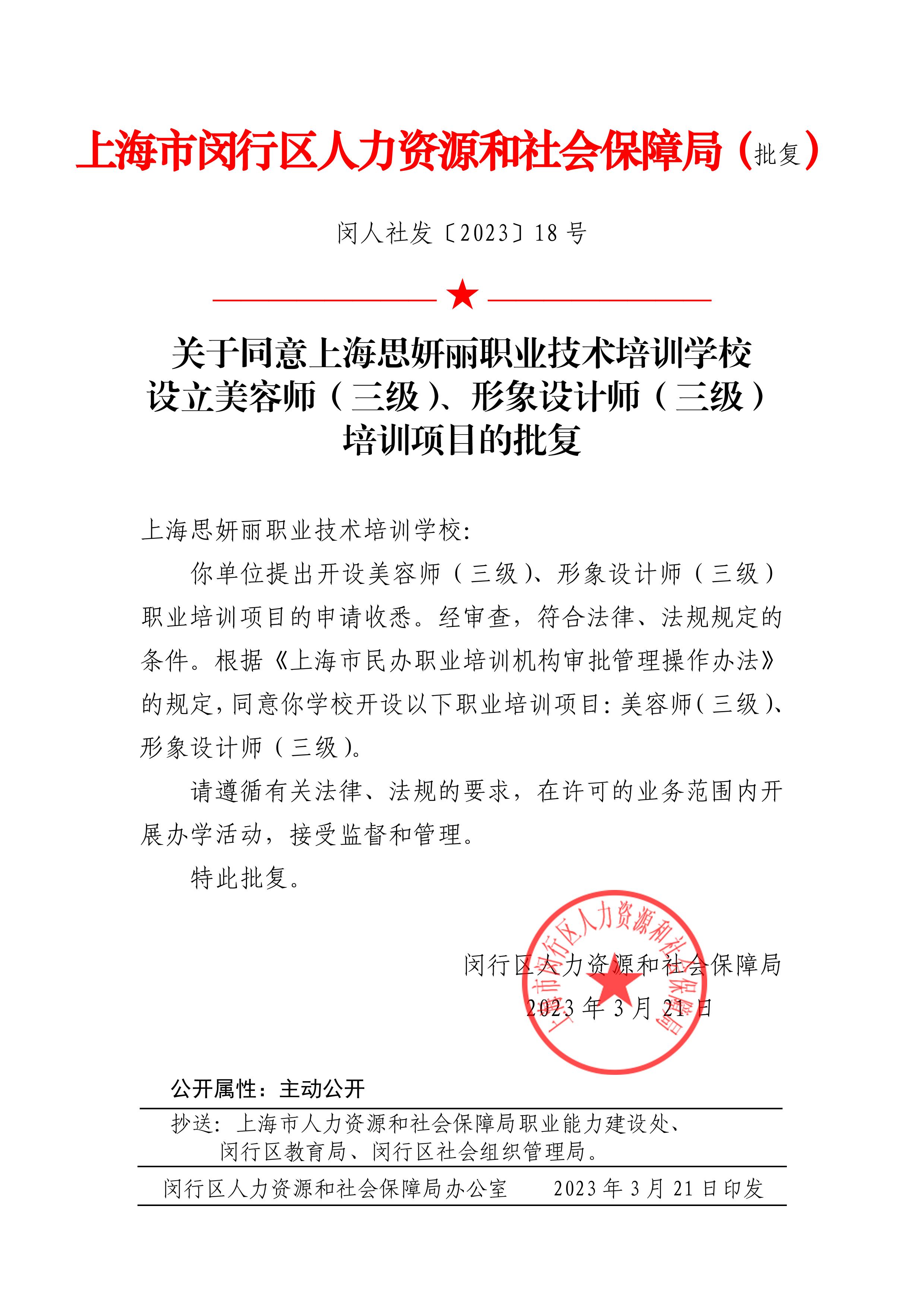上海思妍丽职业技术培训学校: 你单位提出开设美容师(三级)、形象设计师(三级)职业培训项目的申请收悉。经审查,符合法律、法规规定的条件。根据《上海市民办职业培训机构审批管理操作办法》的规定,同意你学校开设以下职业培训项目:美容师(三级)、形象设计师(三级)。 请遵循有关法律、法规的要求,在许可的业务范围内开展办学活动,接受监督和管理。 特此批复。