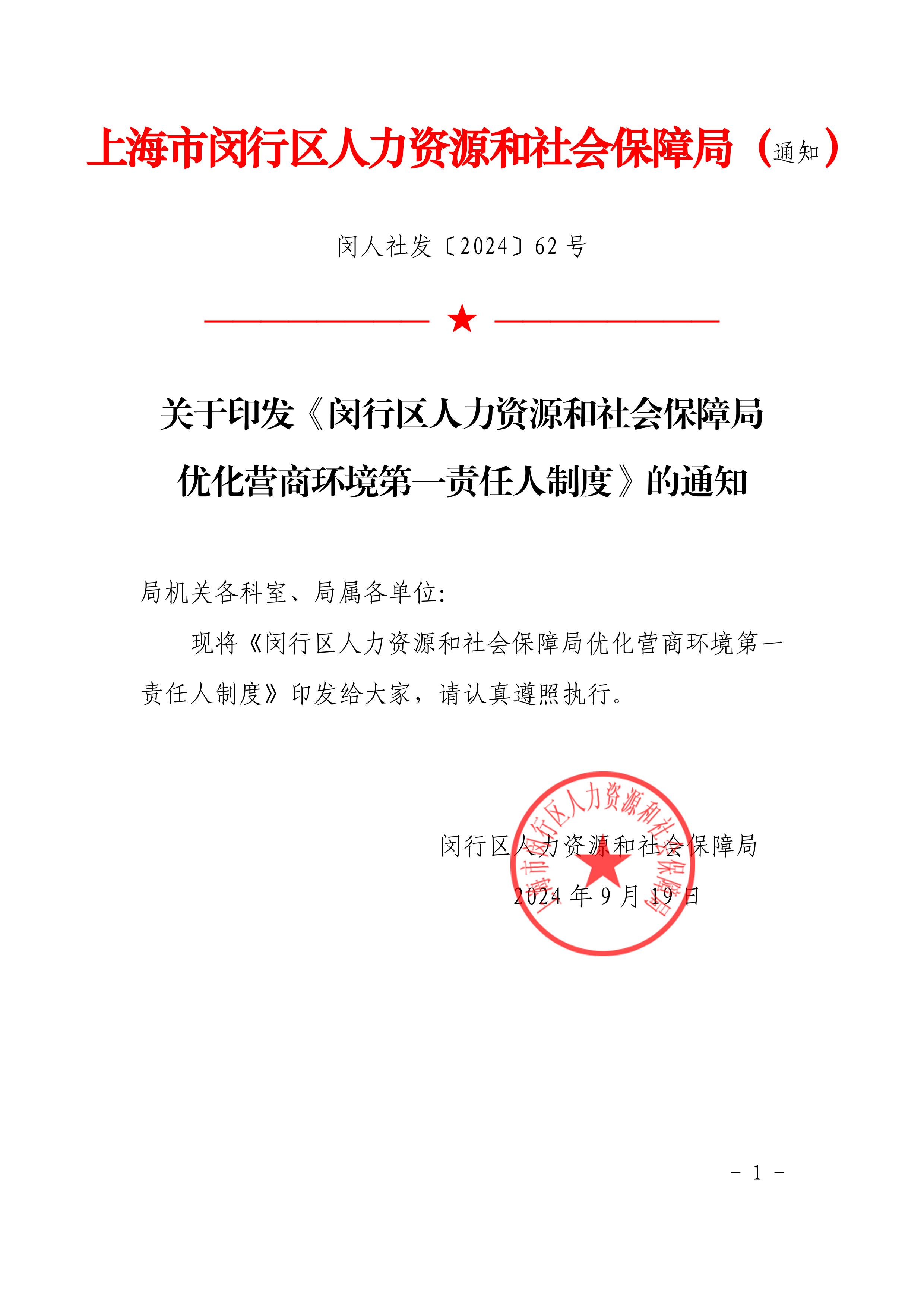 关于印发《闵行区人力资源和社会保障局优化营商环境第一责任人制度》的通知