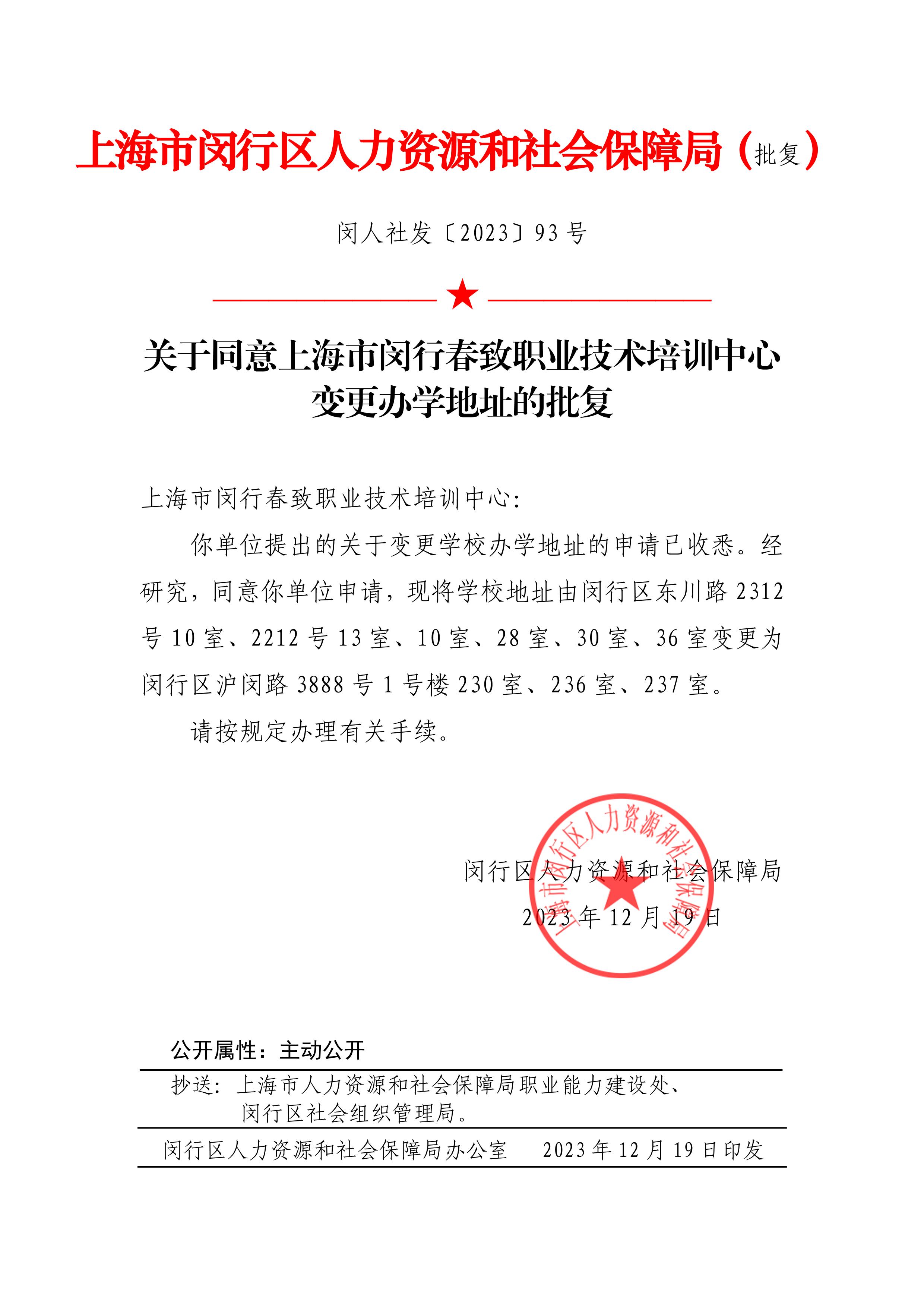 关于同意上海市闵行春致职业技术培训中心变更办学地址的批复