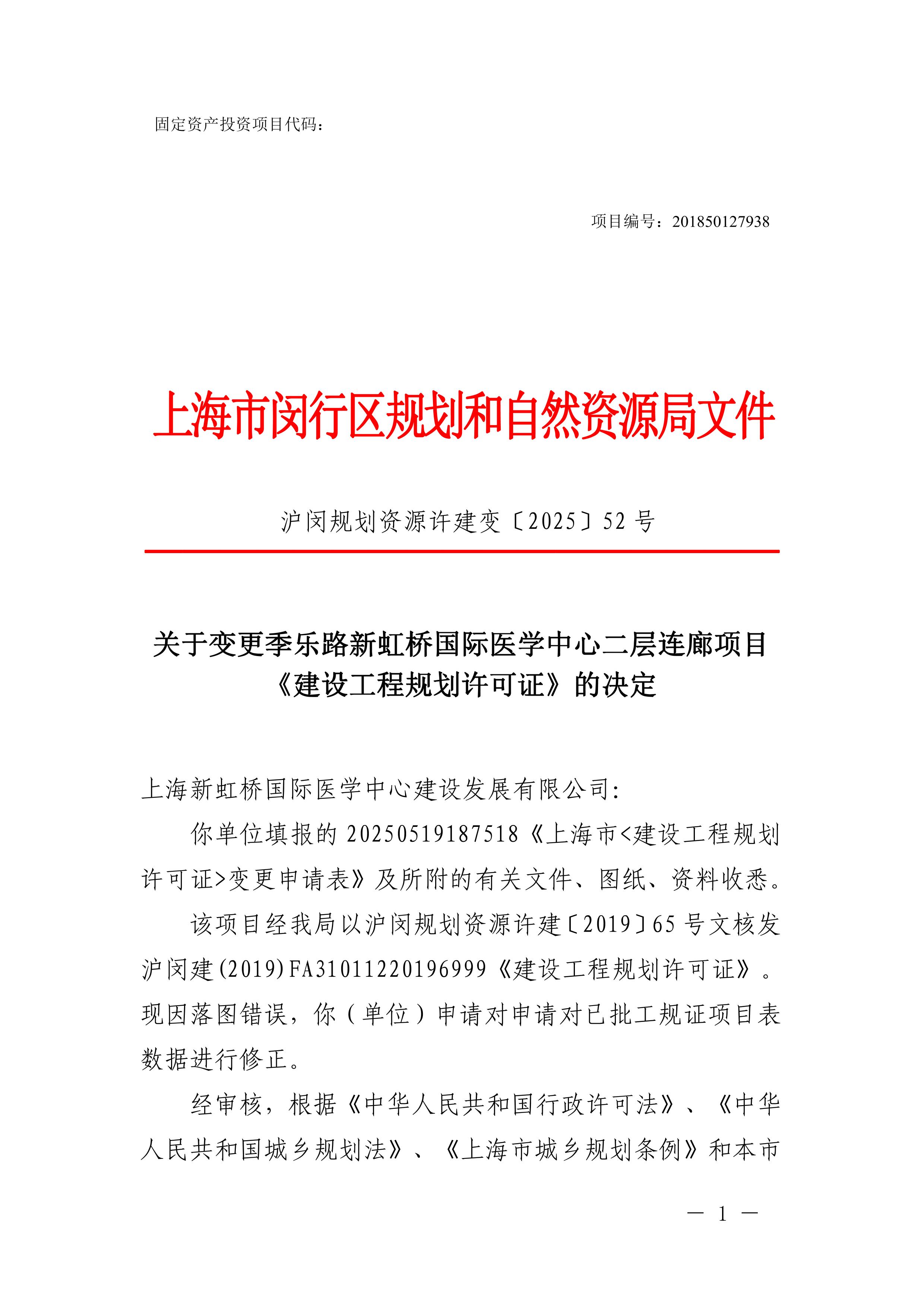 关于变更季乐路新虹桥国际医学中心二层连廊项目《建设工程规划许可证》的决定