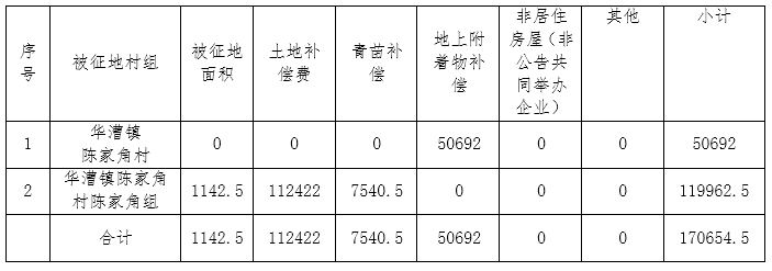 根据《中华人民共和国土地管理法》、《中华人民共和国土地管理法实施条例》、《征收土地公告办法》和《上海市实施〈中华人民共和国土地管理法〉办法》等有关规定,依据上海市人民政府沪府土[2019]220号批文批准的征地方案,现将拟定的《征地补偿安置方案》公告如下: 一、本次征收土地的范围: 闵行区华漕镇陈家角村陈家角组(村队组);征收农用地 1142.5平方米、建设用地 0平方米、未利用地 0平方米,合计征地面积 1142.5平方米。 二、土地补偿费补偿标准、支付对象和支付方式: 土地补偿费标准,按 《上海市征地土地补偿费标准(2017)》(沪规土资综规〔2017〕321号)执行,标准为华漕镇农用地98.4 元/平方米,非农用地98.4 元/平方米,补偿费支付给被征地的农村集体经济组织,支付方式为转账。 三、地上附着物和青苗补偿标准、支付对象和支付方式: 地上附着物补偿标准按《上海市征地财物补偿标准(2017)》(沪规土资综规[2017]321号)执行,补偿费支付给所有者,支付方式为转账。 青苗补偿标准按《上海市征地青苗补偿标准(2017)》(沪规土资综规〔2017〕321号)执行,标准为华漕镇粮棉地4.2 元/平方米,蔬菜地6.6 元/平方米,补偿费支付给所有者,支付方式为转账。 四、征地补偿金额汇总表(单位:平方米,元)