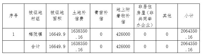 根据《中华人民共和国土地管理法》、《中华人民共和国土地管理法实施条例》、《征收土地公告办法》和《上海市实施〈中华人民共和国土地管理法〉办法》等有关规定,依据上海市人民政府沪府土[2019]491号批文批准的征地方案,现将拟定的《征地补偿安置方案》公告如下: 一、本次征收土地的范围: 梅陇镇(村队组);征收农用地 0平方米、建设用地 16649.9平方米、未利用地 0平方米,合计征地面积 16649.9平方米。 二、土地补偿费补偿标准、支付对象和支付方式: 土地补偿费标准,按 《上海市征地土地补偿费标准(2017)》(沪规土资综规〔2017〕321号)执行,标准为梅陇镇农用地98.4 元/平方米,非农用地98.4 元/平方米,补偿费支付给被征地的农村集体经济组织,支付方式为转账。 三、地上附着物和青苗补偿标准、支付对象和支付方式: 地上附着物补偿标准按《上海市征地财物补偿标准(2017)》(沪规土资综规[2017]321号)执行,补偿费支付给所有者,支付方式为转账。 青苗补偿标准按《上海市征地青苗补偿标准(2017)》(沪规土资综规〔2017〕321号)执行,标准为梅陇镇粮棉地4.2 元/平方米,蔬菜地6.6 元/平方米,补偿费支付给所有者,支付方式为转账。 四、征地补偿金额汇总表(单位:平方米,元)