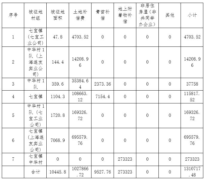 根据《中华人民共和国土地管理法》、《中华人民共和国土地管理法实施条例》、《征收土地公告办法》和《上海市实施〈中华人民共和国土地管理法〉办法》等有关规定,依据上海市人民政府沪府土[2019]467号批文批准的征地方案,现将拟定的《征地补偿安置方案》公告如下: 一、本次征收土地的范围: 七宝镇、七宝镇 (七宝工业公司)、七宝镇 (上海连友实业公司)、中华村1队、中华村1队 (七宝工业公司)、中华村1队 (上海连友实业公司);征收农用地 1463.9平方米、建设用地 8981.9平方米、未利用地 0平方米,合计征地面积 10445.8平方米。 二、土地补偿费补偿标准、支付对象和支付方式: 土地补偿费标准,按 《上海市征地土地补偿费标准(2017)》(沪规土资综规〔2017〕321号)执行,标准为七宝镇农用地98.4 元/平方米,非农用地98.4 元/平方米,补偿费支付给被征地的农村集体经济组织,支付方式为转账。 三、地上附着物和青苗补偿标准、支付对象和支付方式: 地上附着物补偿标准按《上海市征地财物补偿标准(2017)》(沪规土资综规[2017]321号)执行,补偿费支付给所有者,支付方式为转账。 青苗补偿标准按《上海市征地青苗补偿标准(2017)》(沪规土资综规〔2017〕321号)执行,标准为七宝镇粮棉地4.2 元/平方米,蔬菜地6.6 元/平方米,补偿费支付给所有者,支付方式为转账。 四、征地补偿金额汇总表(单位:平方米,元)