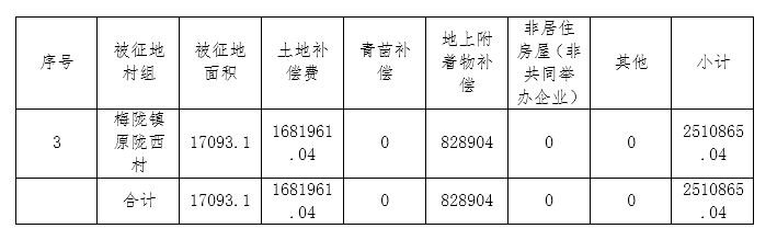根据《中华人民共和国土地管理法》、《中华人民共和国土地管理法实施条例》、《征收土地公告办法》和《上海市实施〈中华人民共和国土地管理法〉办法》等有关规定,依据上海市人民政府沪府土[2019]590号批文批准的征地方案,现将拟定的《征地补偿安置方案》公告如下: 一、本次征收土地的范围: 梅陇镇(原陇西村);征收农用地 0平方米、建设用地 17093.1平方米、未利用地 0平方米,合计征地面积 17093.1平方米。 二、土地补偿费补偿标准、支付对象和支付方式: 土地补偿费标准,按 《上海市征地土地补偿费标准(2017)》(沪规土资综规〔2017〕321号)执行,标准为梅陇镇农用地98.4 元/平方米,非农用地98.4 元/平方米,补偿费支付给被征地的农村集体经济组织,支付方式为 转账。 三、地上附着物和青苗补偿标准、支付对象和支付方式: 地上附着物补偿标准按《上海市征地财物补偿标准(2017)》(沪规土资综规[2017]321号)执行,补偿费支付给所有者,支付方式为转账。 青苗补偿标准按《上海市征地青苗补偿标准(2017)》(沪规土资综规〔2017〕321号)执行,标准为梅陇镇粮棉地4.2 元/平方米,蔬菜地6.6 元/平方米,补偿费支付给所有者,支付方式为转账。 四、征地补偿金额汇总表(单位:平方米,元)